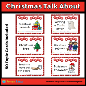 This set of seasonal oral language Task Cards could be done with pupils in many different class groups. The cards are intended to be used as a fun game/task to develop vocabulary and oral language. There are 50 Christmas-themed topic cards in this pack, four per A4 page.