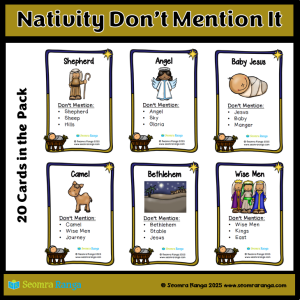 This seasonal oral language activity is aimed at pupils probably in the middle/senior classes. A pupil randomly selects one of the 20 Nativity-themed cards from the pack. They have to describe the word at the top of the card. However, they must not mention any of the three words on the bottom of the card.