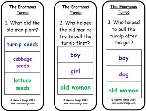 Peg Enormous TurnipThis resource is aimed at junior pupils or SEN pupils at the beginning of literacy work on comprehension. It is based on the Ladybird “Read It Yourself” version of the story, but could probably be used with any version. Either the pupil reads the story themselves, or the teacher/SNA reads the story to the pupil.