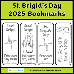 These bookmarks are intended to help mark the celebration of St. Brigid’s Day on February 1st. There are 21 different bookmarks in the download in portrait and landscape and in both English and Gaeilge. The bookmarks are in blackline for pupils to colour and decorate and they are printed three per A4 page.