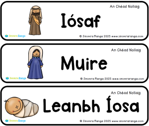 This seasonal classroom display resource as Gaeilge is aimed at pupils in younger classes who are learning about the story of the Nativity. 18 illustrated flashcards are included in the display pack which contains all of the usual characters/items from the story you would expect. They are printed three flashcards per A4 page.
