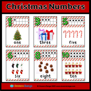 This set of eleven seasonal posters, aimed at pupils in infant classes, focuses on the numbers zero to ten. Each A4 poster features the numeral, the word for the numeral, the ten frame representing the numeral and a large high quality Christmas-themed photograph which gives an example of the number.