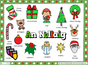 With the theme of Christmas well under way in many classrooms throughout the country, this seasonal image mat as Gaeilge might be a welcome addition to talk, discussion and writing on the theme of Christmas.