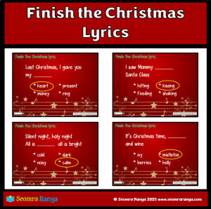 This seasonal PPTX resource would be great for an end-of-term fun activity and could be done with pupils in a variety of age groups. Doing this activity, pupils could show their knowledge of lyrics from the most popular Christmas songs and carols. There are 50 different lyrics for pupils to solve.