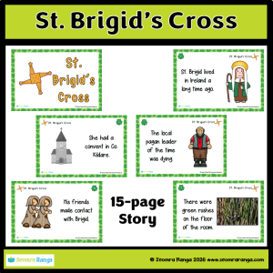 This seasonal resource is a simple re-telling of the story of the St. Brigid’s Cross. The story is told in poster format made up of 15 illustrated posters. These could be printed out and displayed in the classroom or they could be read by pupils on the IWB.