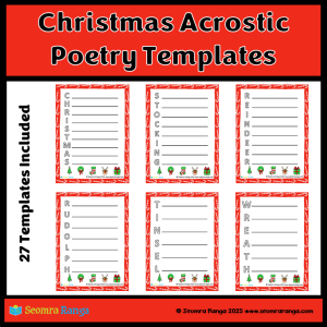 An acrostic poem is one where the beginning letter of each line spells out a particular word. Pupils generally tend to like to write these poems as they are easier than other types of poetry. This seasonal resource contains 27 Christmas-themed Acrostic Poetry templates for pupils to write their own seasonal poetry.